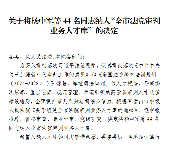 近日,石嘴山市中级人民法院正式建立“全市法院审判业务人才库”,来自刑事、民商事、行政、执行等审判一线的44名业务骨干成为首批入库人员。此举标志着石嘴山法院在深入推进审判队伍专业化建设、构建科学系统的人才培养体系方面,迈出了重要一步。