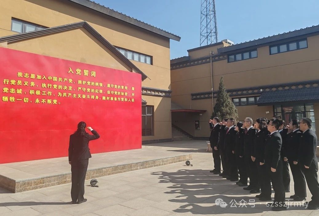“我志愿加入中国共产党......随时准备为党和人民牺牲一切......”在党旗前,全体党员庄严宣誓,重温入党誓词,进一步强化“为大局服务、为人民司法”的使命担当。