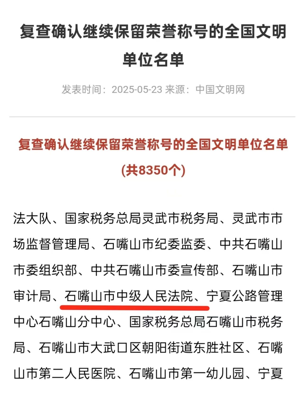 近日,中央宣传思想文化工作领导小组发布《关于复查确认继续保留荣誉称号的全国文明城市、文明村镇、文明单位、文明家庭、文明校园的通报》,石嘴山市中级人民法院通过复查确认,继续保留“全国文明单位”荣誉称号。石嘴山市中级人民法院自2017年获评“全国文明单位”以来,始终坚持以习近平新时代中国特色社会主义思想为指导,学思践悟习近平法治思想,牢牢把握铸牢中华民族共同体意识主线,坚持围绕中心,服务大局,聚焦“公正与效率”工作主题,稳中求进、改革创新,不断完善党组主要负责人亲自抓,分管领导具体抓,各部门相互协调配合的工作格局,优化齐抓共管的精神文明建设长效机制,全力推动精神文明建设工作与法院年度总体工作规划、审判执行中心工作同部署、同推进、同落实,大力培育和践行社会主义核心价值观,教育引导全体干警自觉将全国文明单位荣誉转化为推动审判事业发展、强化责任担当的强大动力。此次蝉联“全国文明单位”荣誉称号,是对石嘴山市中级人民法院长期以来精神文明建设工作的充分肯定,是全体干警的光荣和骄傲。