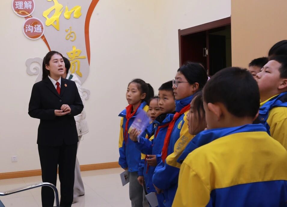 “小小体验官”们在法官的带领下,有序参观了安检大厅、立案大厅、刑事审判法庭及青少年法庭、家事法庭等特色法庭,通过威严的审判席、神圣的法徽、清脆的法槌声,将抽象的法律知识融入实地参观,沉浸式解锁法庭奥秘、聆听法治声音,在互动体验中播下尊法守法的种子。