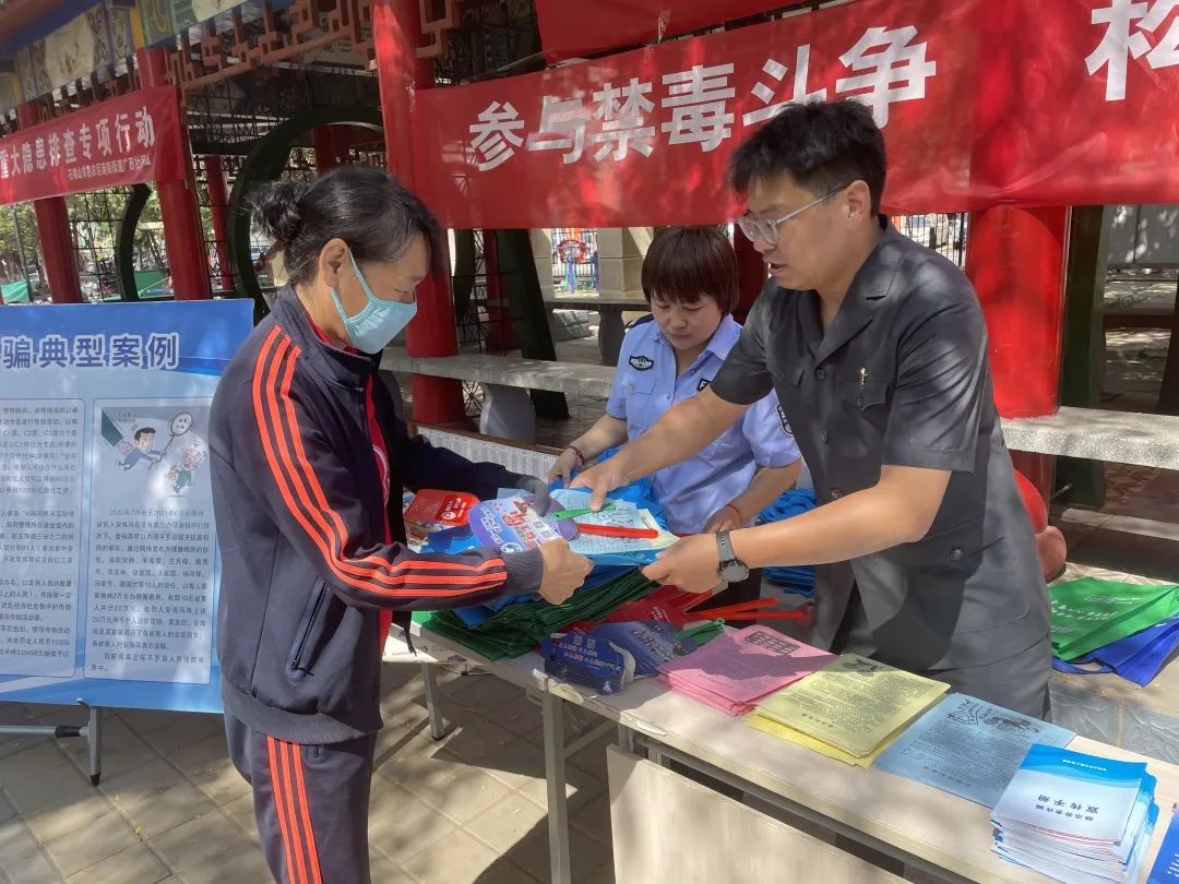 在惠农区南街憩园广场,干警们悬挂起“参与禁毒斗争 构建和谐社会”的醒目横幅,先后向过往群众发放禁毒宣传资料400余份,解答禁毒相关法律问题30余人次。