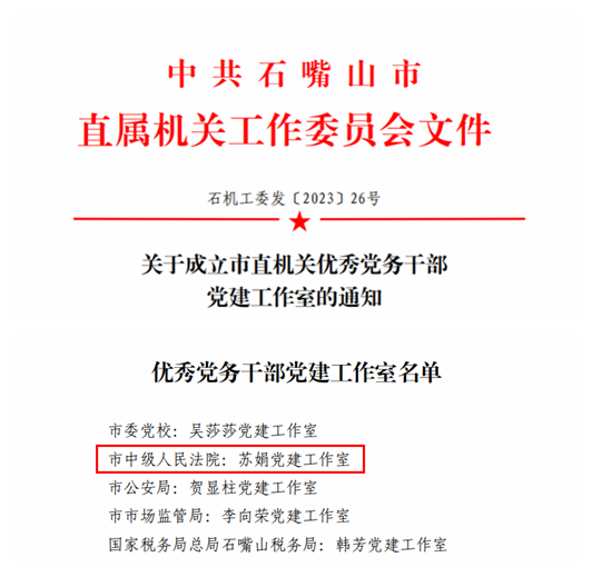 苏娟党建工作室是今年石嘴山市直机关首批成立的5个优秀党务干部党建工作室之一,也是石嘴山市中级人民法院打造党建特色工作,推动“四强”党支部创建和实施党支部建设提档升级行动的一个平台。工作室采取团队模式,机关党委专职副书记苏娟同志作为工作室主持人,6名在职机关党支部书记为成员,围绕党建任务重点开展党建指导、党务培训、品牌策划等工作,研究解决党建工作难点堵点问题,探索行之有效的“党建+”行动,以点带面提升机关党建质效。