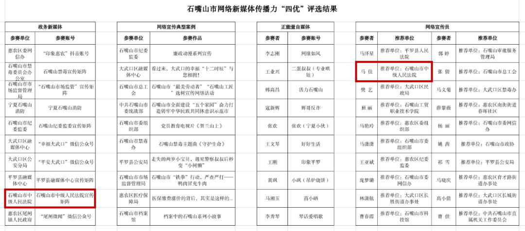 近日,在由石嘴山市人民政府办公室、中共石嘴山市委宣传部、中共石嘴山市委网信办联合组织开展的2023年度石嘴山市网络新媒体传播力“四优”选树宣传活动中,石嘴山市中级人民法院宣传矩阵获评“优秀政务新媒体”、政治处宣教科科长马佳获评“优秀网络宣传员”。